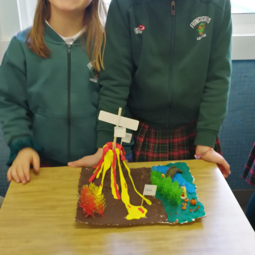 Por la tarde organizamos una exposición de maquetas y trabajos realizados por ellos en torno a varios temas que decidimos ampliar según sus centros de interés: los dinosaurios, los terremotos, los maremotos, rocas y minerales, las distintas Eras y los volcanes.